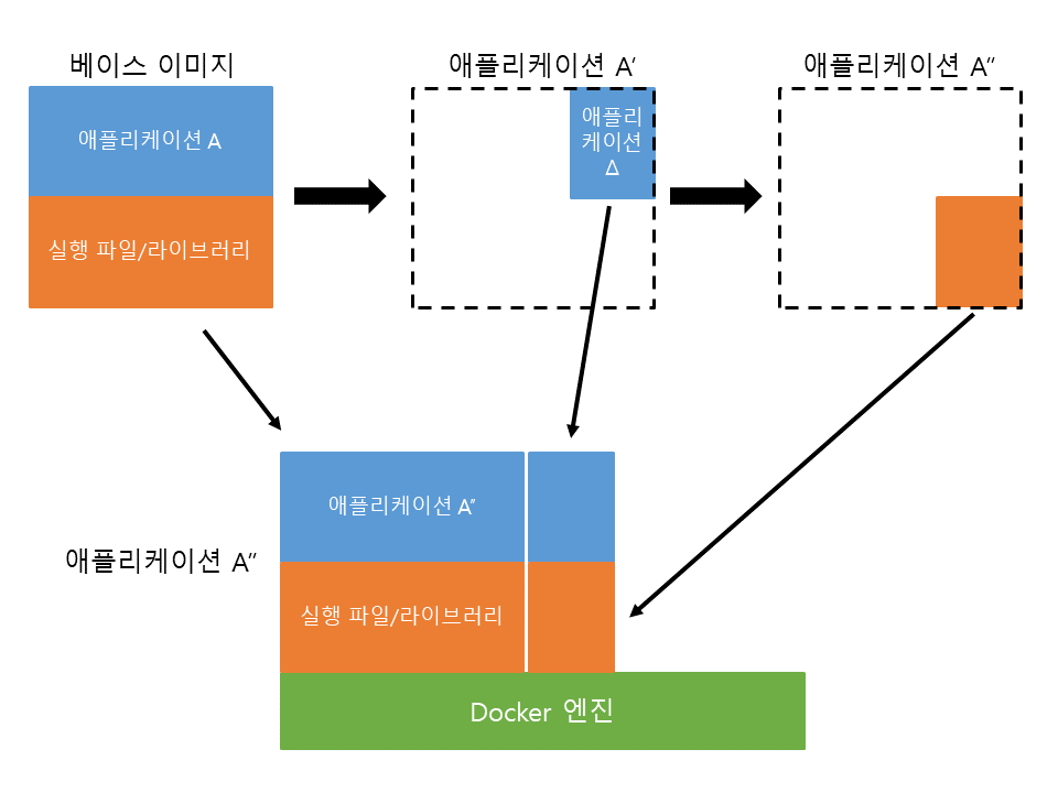매번 베이스 이미지에 필요한 프로그램과 라이브러리, 소스를 설치하면 용량이 큰 이미지가 중복되어 생성될 것이라고 생각하기 쉽습니다. Docker 이미지는 베이스 이미지에서 바뀐 부분(Δ)만 이미지로 생성하고, 실행할 때는 베이스 이미지와 바뀐 부분을 합쳐서 실행합니다.