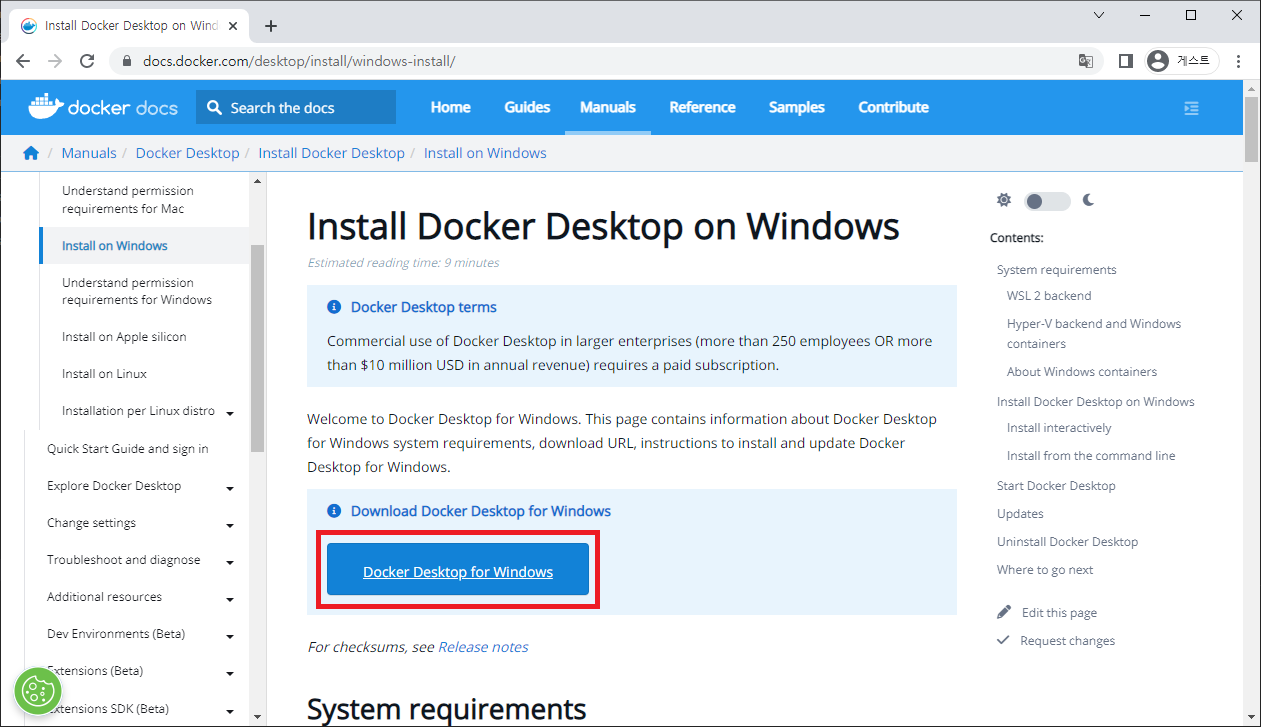 그림 2-11 Docker 웹사이트 Docker Desktop Installer.exe 파일 다운로드