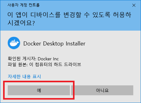 파일 다운로드가 끝났으면 Docker Desktop Installer.exe 파일을 실행합니다. 사용자 계정 컨트롤 창이 표시되면 예 버튼을 클릭합니다.