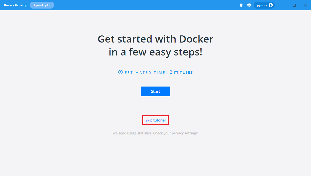 잠시 기다리면 Docker Engine이 실행되고 Get started with Docker in a few easy steps! 창이 표시됩니다. Skip tutorial을 클릭합니다.