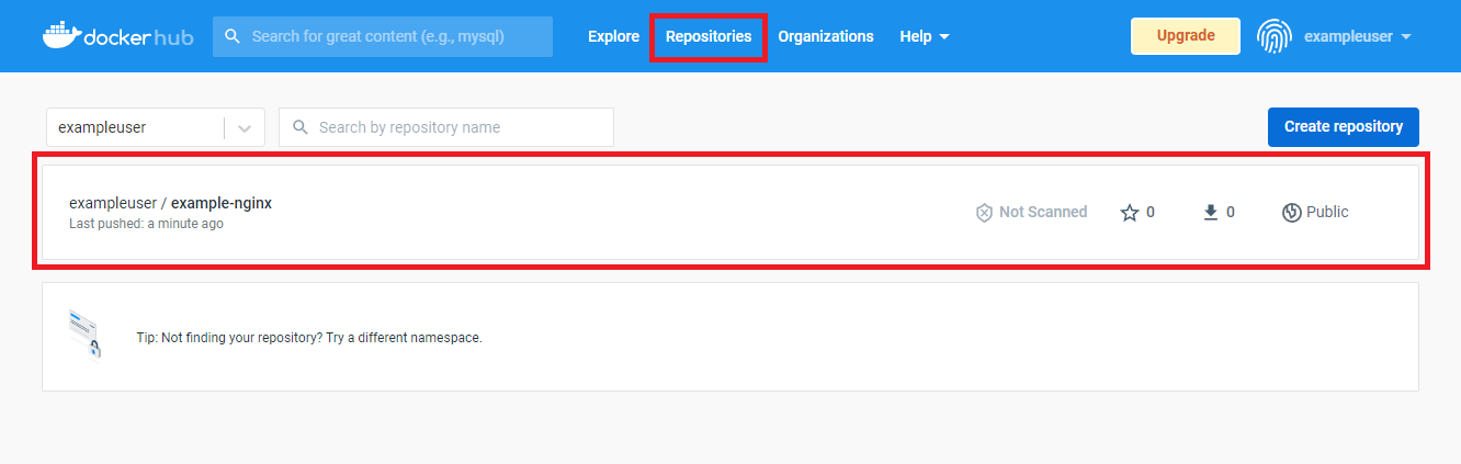 잠시 기다리면 이미지가 Docker Hub의 공개 저장소에 완전히 올라갑니다. Docker Hub 페이지에서 Repositories 메뉴를 클릭하면 방금 올렸던 <Docker Hub 사용자 계정>/example-nginx 이미지가 표시됩니다(Docker Hub에 생성된 공개 저장소가 없다면 이미지를 올렸을 때 공개 저장소가 자동으로 생성됩니다).