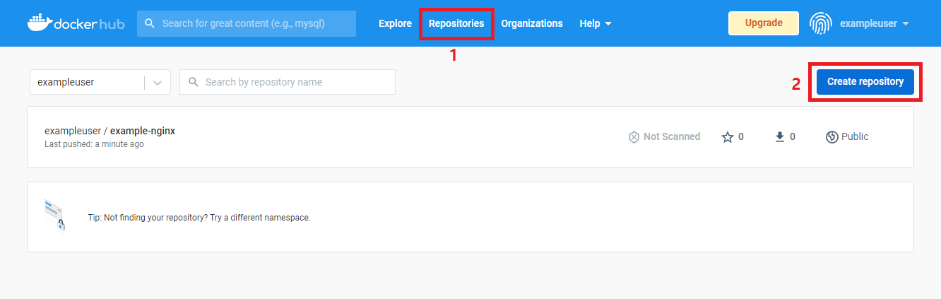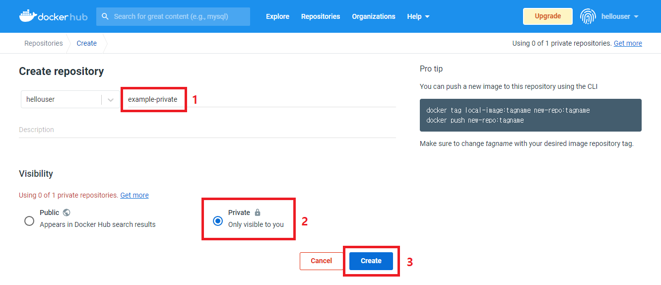 이번에는 Docker Hub에서 개인 저장소(Private Repository)를 생성하는 방법입니다. Docker Hub에 로그인한 뒤 위쪽 메뉴에서 Repositories를 클릭합니다. 그리고 오른쪽 위 Create repository를 클릭합니다.