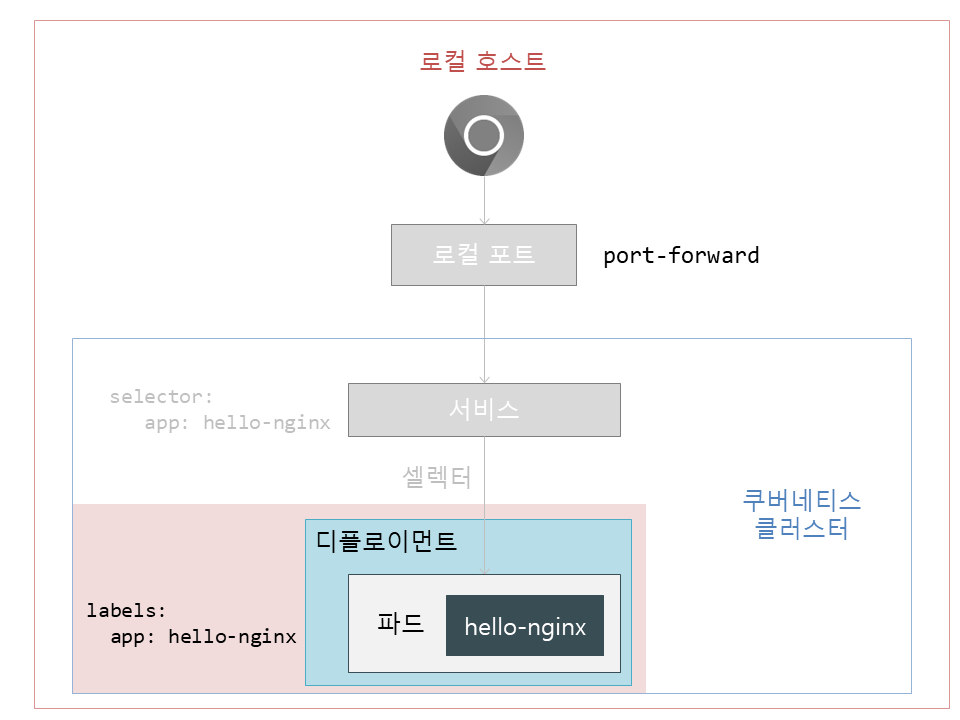 .spec.replicas: 레플리카셋에서 파드를 몇 개 유지할지 설정합니다. 여기서는 1로 설정해서 1개만 유지합니다..spec.selector: 디플로이먼트가 관리할 파드를 찾는 방법을 정의합니다. 여기서는matchLabels에app: hello-nginx로 설정했으므로 키가app, 값이hello-nginx로 정확히 일치하는 파드를 찾습니다..spec.template: 여기서부터 파드 설정입니다.metadata:labels에 키-값을 설정하여 디플로이먼트가 찾을 수 있도록 합니다. 여기서는app: hello-nginx를 설정했습니다.spec: 파드의spec입니다. 파드에는 컨테이너가 여러 개 들어갈 수 있어서containers로 되어있고, 그 아래에는-를 사용하여 배열(Array)로 값을 설정합니다.containers:name에는 컨테이너의 이름을 설정합니다. 여기서는hello-nginx로 설정했지만 셀렉터와는 상관이 없습니다.image에는 컨테이너를 실행할 Docker 이미지를 설정합니다.<이미지>:<태그>형식이며 여기서는nginx:latest를 설정했습니다. 마지막으로ports아래에 배열 형태로containerPort를 설정합니다.containerPort는 컨테이너에서 개방할 포트 번호를 뜻합니다. 여기서는 Nginx 웹 서버의 HTTP 포트인 80을 설정했습니다.