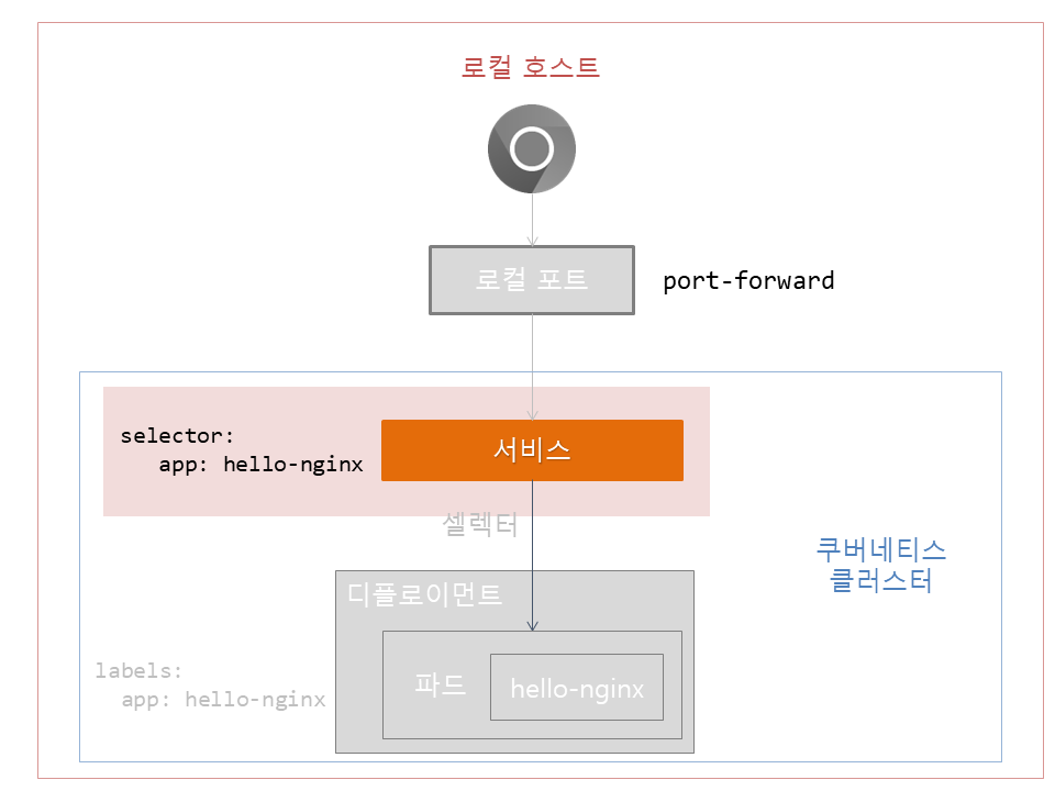 .spec.selector: 서비스가 트래픽을 전달할 파드를 선택합니다. 여기서는app: hello-nginx을 설정했으므로 키가app, 값이hello-nginx인 파드를 찾습니다..spec.ports: 서비스의 포트 설정이며-를 사용하여 배열(Array)로 값을 설정합니다.protocol은 서비스가 처리할 프로토콜이며 여기서는 HTTP만 처리하므로 TCP로 설정합니다.port는 서비스가 개방할 포트입니다. 여기서는 80을 설정했습니다.targetPort는 파드에 열려 있는 포트를 의미합니다. 따라서 80을 설정합니다..spec.type: 서비스의type은 여러 가지가 있지만 여기서는ClusterIP를 설정하여 쿠버네티스 네트워크 안에서만 포트를 노출하도록 합니다.