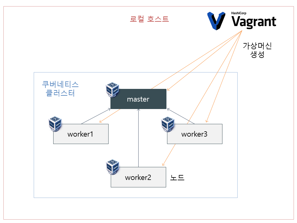 VirtualBox, Parallels Desktop Pro와 Vagrant 설치가 끝났으면 본격적으로 쿠버네티스 클러스터를 구축해보겠습니다. 이번에 구축할 클러스터의 형태는 다음과 같습니다.