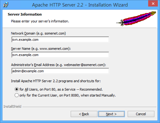 여기서는 127.0.0.1(지금 설치하고 있는 컴퓨터)를 svn.example.com으로 설정했습니다. 이렇게 하면 현재 쓰고 있는 컴퓨터에서 http://svn.example.com으로 접속하면 방금 설치한 아파치로 접속하게 됩니다.