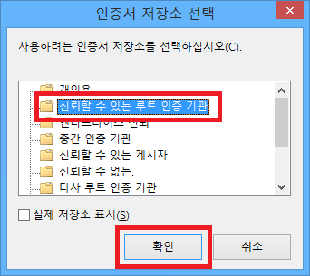 신뢰할 수 있는 루트 인증 기관을 선택하고 확인 버튼을 클릭합니다. 그리고 다음 버튼을 클릭합니다.