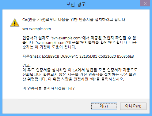 이제 웹 브라우저를 다시 시작한 뒤 https://svn.example.com/svn/sample에 접속하면 보안 경고가 뜨지 않게 됩니다.