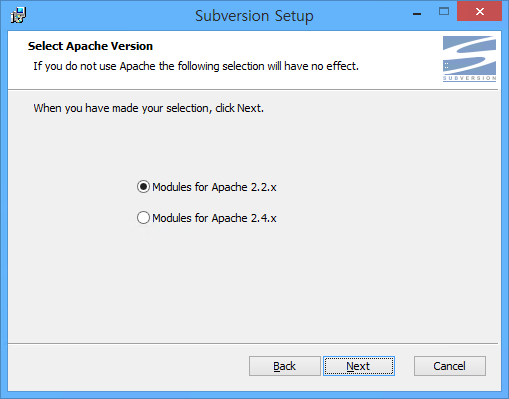 아파치를 먼저 설치하면 Subversion 인스톨러가 아파치를 인식해서 버전 선택 화면이 나옵니다. Modules for Apache 2.2.x를 선택합니다.