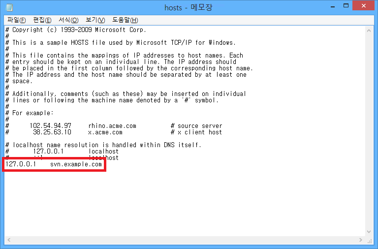 하지만 다른 컴퓨터에서는 어느 컴퓨터가 svn.example.com인지 모르기 때문에 hosts 파일을 편집하여 아파치가 설치된 컴퓨터의 IP 주소를 svn.example.com으로 설정해줘야 합니다.