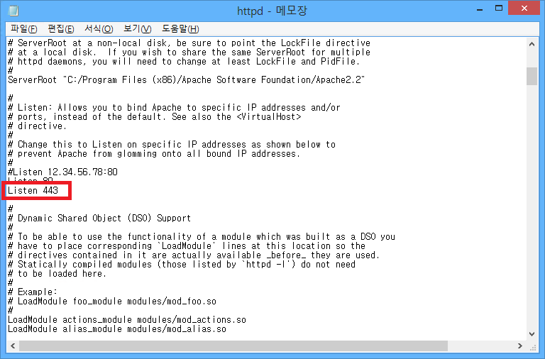 아파치 설정 파일 C:\Program Files (x86)\Apache Software Foundation\Apache2.2\conf\httpd.conf에서 mod_ssl.so 부분의 #을 삭제하여 ssl_module을 활성화 시킵니다.