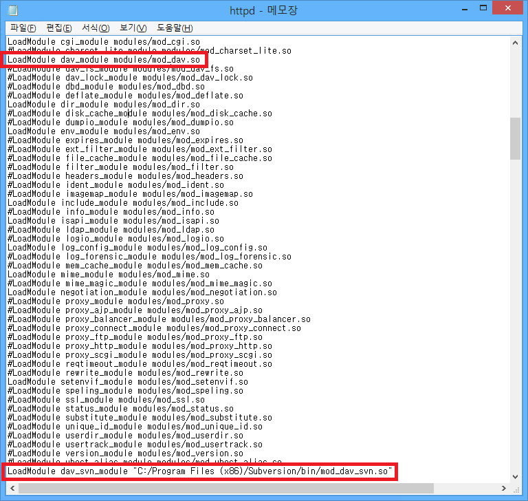 mod_dav.so 부분의 #을 삭제하여 dav_module을 활성화시킵니다. 그리고 아래 dav_svn_module 설정을 추가합니다.