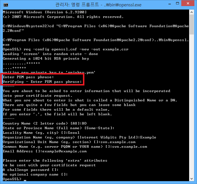 이렇게 하면 C:\Program Files (x86)\Apache Software Foundation\Apache2.2\conf에 privkey.pem, example.csr 파일이 생성되었을 것입니다.