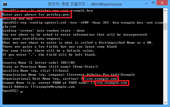 example.key를 만들때에는 암호를 물어보는데 개인키 암호를 입력합니다.