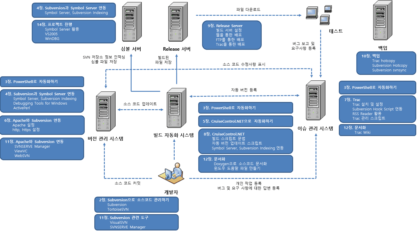 요즘에는 Subversion, Trac, CruiseControl과 같은 도구를 함께 사용하는 것이 표준처럼 되어버렸습니다. 불행히도 이런 종류의 책들은 대부분 자바나 웹 개발자를 위한 것입니다.