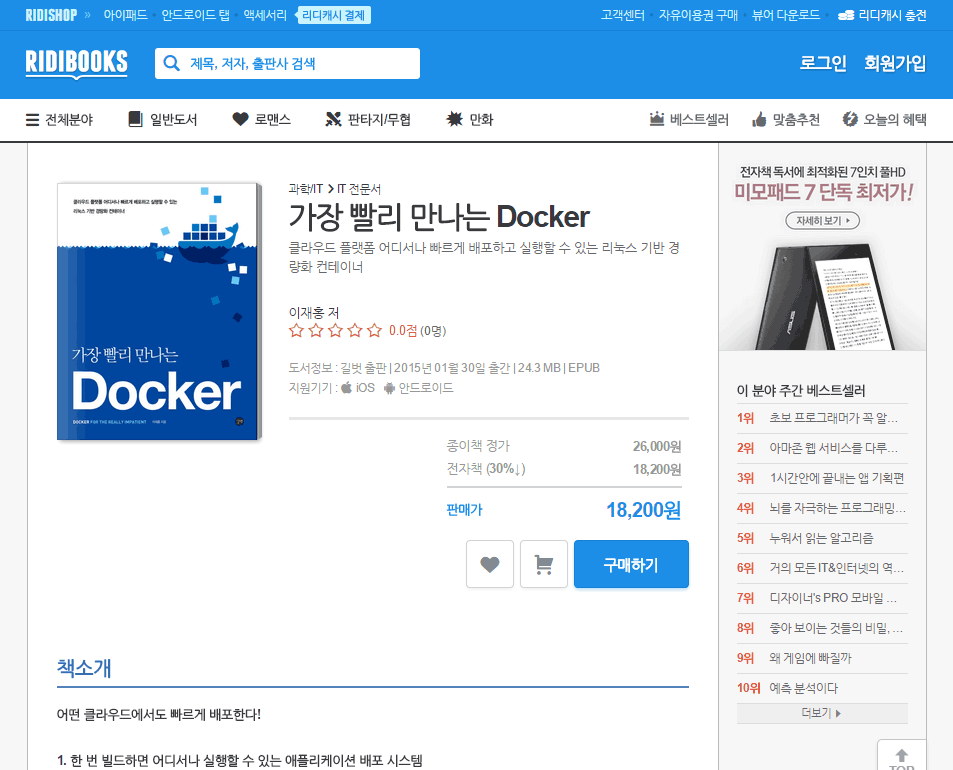 드디어 "가장 빨리 만나는 Docker: 클라우드 플랫폼 어디서나 빠르게 배포하고 실행할 수 있는 리눅스 기반 경량화 컨테이너" 전자책이 출간되었습니다.